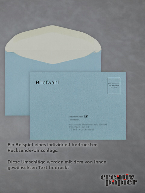 Diese Rücksendeumschläge bedrucken wir für Sie mit Texten und Adresse nach Ihren Wünschen.