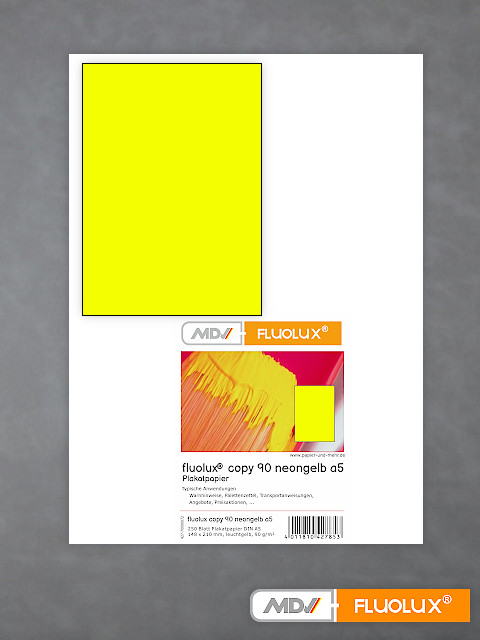 fluolux® 90 copy Plakatpapier ist ein einseitig mit sehr intensiv fluoreszierenden Leuchtfarben beschichtetes Laser- und Kopierpapier. Die Leuchtfarben-Beschichtung besteht aus hitzefesten und formaldehydfreien Pigmenten. Die Leuchtfarben-Beschichtung besteht aus formaldehydfreien und hitzefesten Pigmenten. Somit werden beim Fixieren keine gesundheitsschädlichen Schadstoffe aus der Farbschicht freigesetzt.
