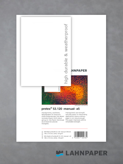pretex® Typ 53 -manual- ist ein Synthesefaserpapier. Das Spezialpapier wird aus einer Kombination von Zellstoffen und synthetischen Fasern hergestellt. Die Synthesefasern geben dem Papier eine beeindruckende Reißfestigkeit, absolut reißfest ist pretex® 53.120 - manual- nicht. Die Imprägnierung sorgt für die Wasserfestigkeit. Die Oberflächen sind veredelt und für gängige Druckverfahren aber auch für manuelle Beschriftung geeignet.