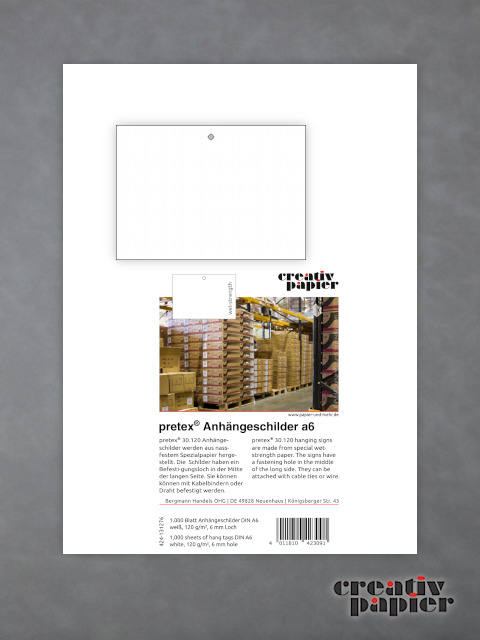 pretex® 30.120 Anhängeschilder a6 sind aus strapazierfähigen, nassfestem Spezialpapier hergestellt, dass für Laserdrucker optimiert ist. Es findet dort Anwendungen, wo Papiere im trocknen oder nassen Zustand stärker beansprucht werden. Die Hängeschilder können mittels Kabelbinder, Nylonfäden oder Draht befestigt werden.
